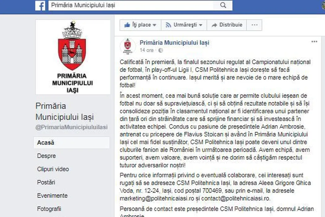 Se leapădă Primăria și de fotbal? Anunț incredibil postat pe pagina de Facebook a municipalității ieșene