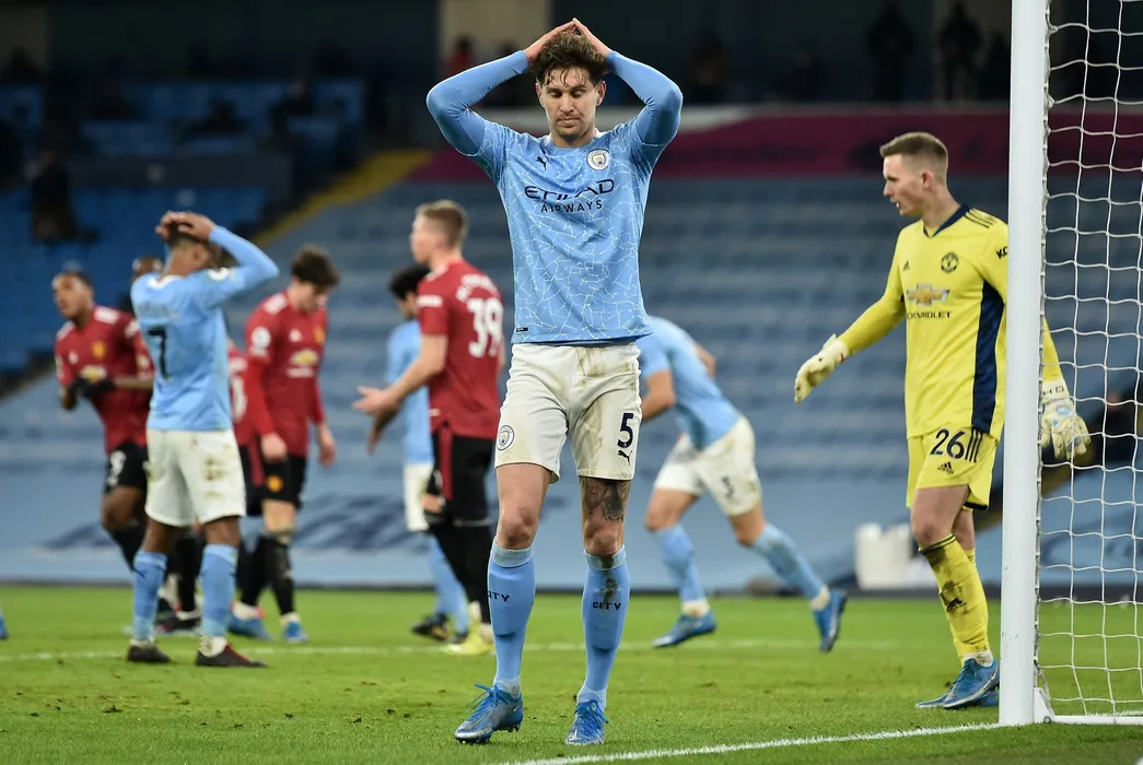 Manchester City's English defender John Stones reacts during the English Premier League football match between Manchester City and Manchester United at the Etihad Stadium in Manchester, north west England, on March 7, 2021.,Image: 595859830, License: Rights-managed, Restrictions: RESTRICTED TO EDITORIAL USE. No use with unauthorized audio, video, data, fixture lists, club/league logos or 'live' services. Online in-match use limited to 120 images. An additional 40 images may be used in extra time. No video emulation. Social media in-match use limited to 120 images. An additional 40 images may be used in extra time. No use in betting publications, games or single club/league/player publications., Model Release: no