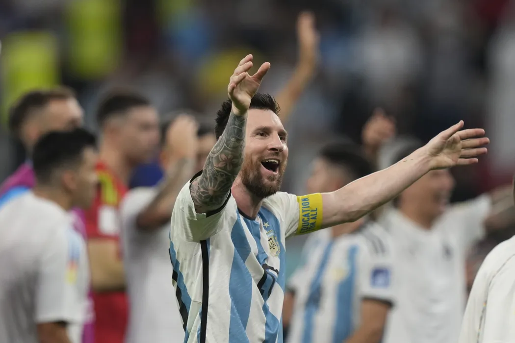 Argentina's Lionel Messi and his teammates celebrate after the World Cup round of 16 soccer match between Argentina and Australia at the Ahmad Bin Ali Stadium in Doha, Qatar, Saturday, Dec. 3, 2022. (AP Photo/Frank Augstein)