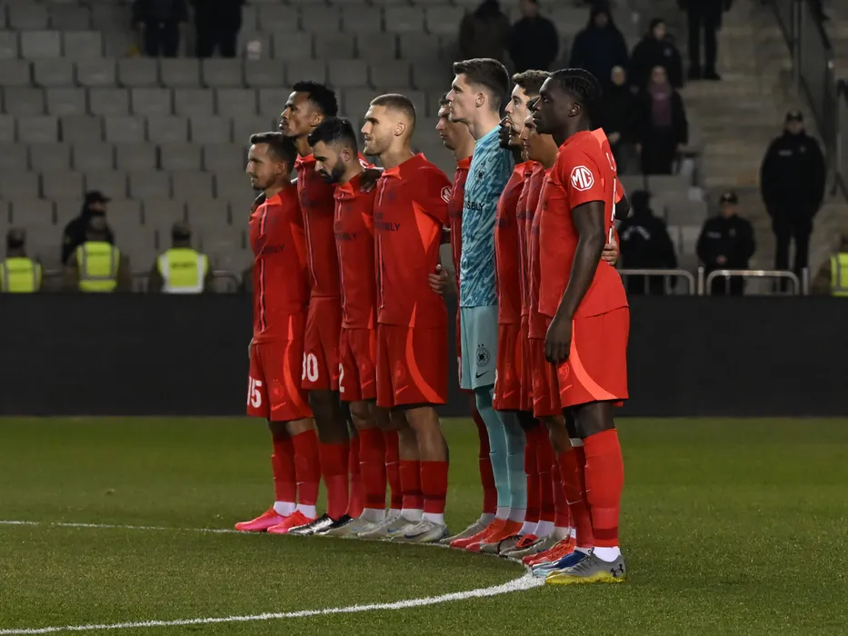 Fotbaliștii ros-albastrii la startul meciului de fotbal dintre Qarabag si FCSB, din cadrul UEFA Europa League, desfasurat pe Stadionul Republican Tofiq Bahramov din Baku, joi 23 ianuarie 2025. © FOTO:Razvan Pasarica/SPORT PICTURES