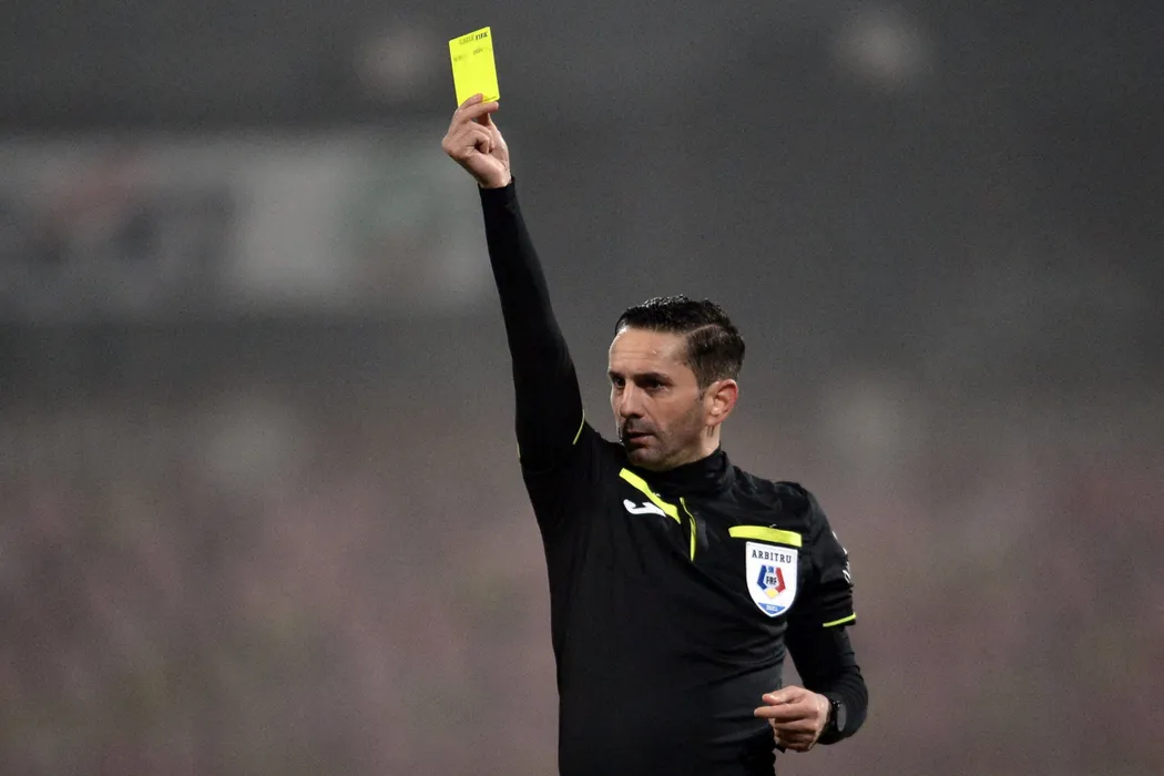 Arbitrul Sebastian Coltescu arata un cartonas galben in timpul meciului de fotbal dintre Dinamo - FCSB din etapa a XXI-a a Ligii 1, disputat pe stadionul Dinamo din Bucuresti, miercuri, 3 februarie 2021. ALEXANDRU DOBRE / MEDIAFAX FOTO