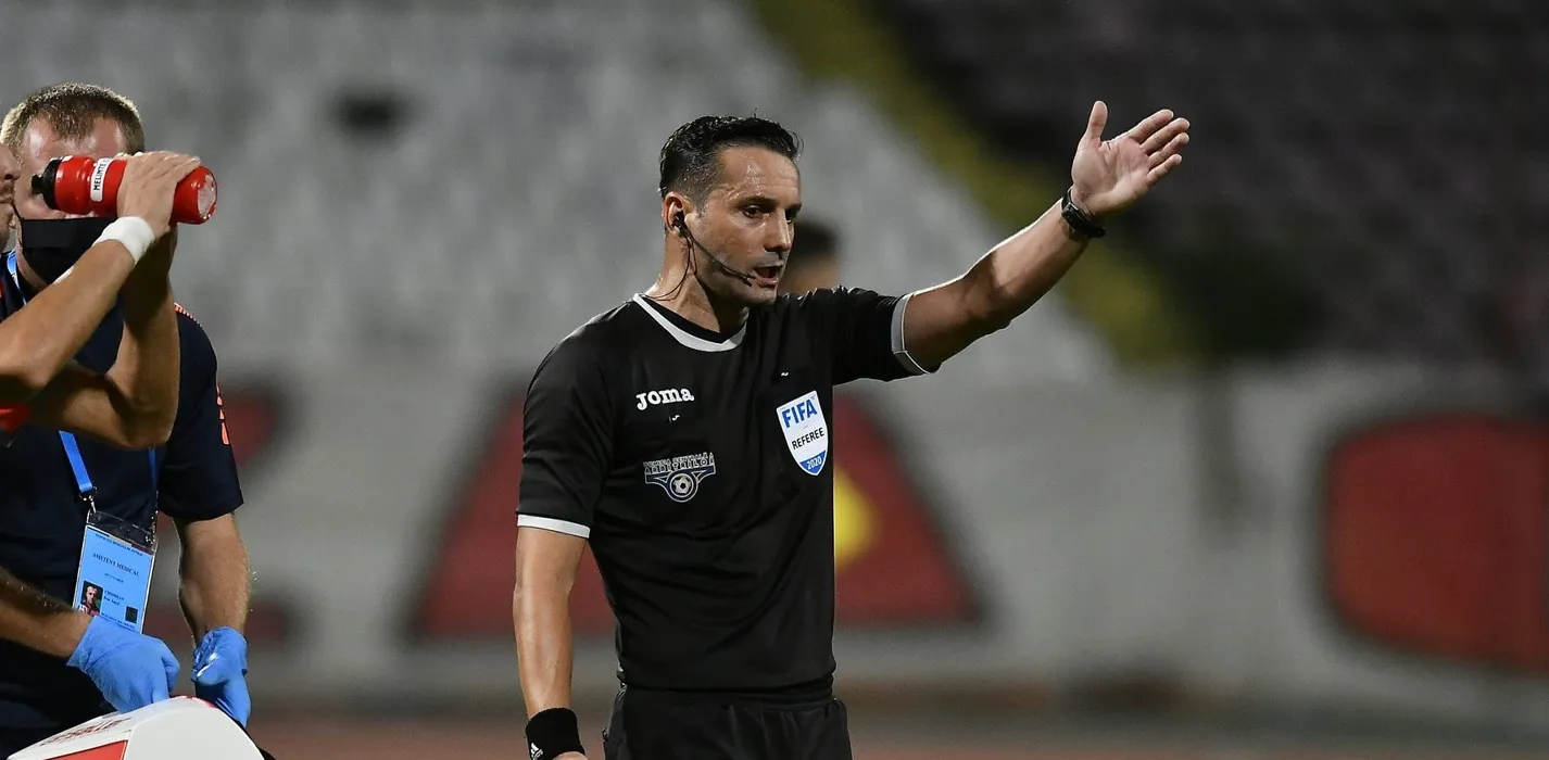 Valentin Buhacianu alaturi de arbitrul central Sebastian Coltescu in meciul de fotbal dintre Dinamo Bucuresti si UTA Arad, contand pentru Liga 1 Casa Pariurilor, desfasurat fara spectatori pe Stadionul Dinamo din Bucuresti, luni 28 septembrie 2020. © FOTO:Razvan Pasarica/SPORT PICTURES