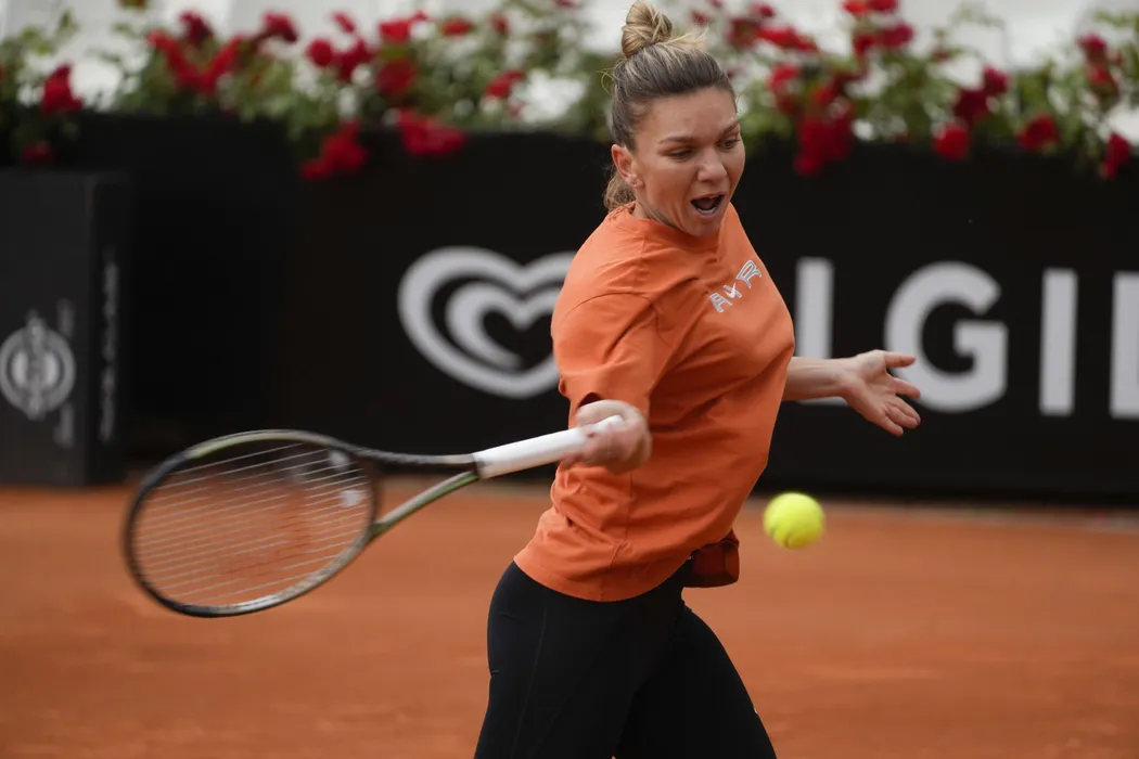 Simona Halep, of Romania, returns the ball during a training session on the occasion of the Italian Open tennis tournament, in Rome, Friday, May 6, 2022. (AP Photo/Gregorio Borgia)