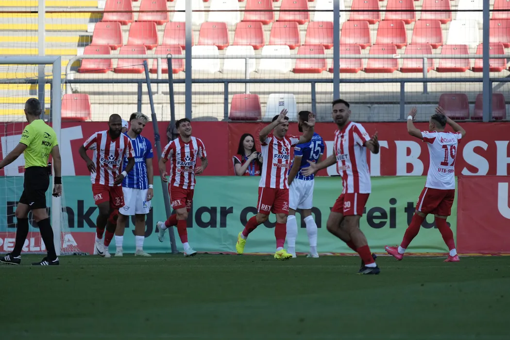 Fotbalistii aradeni se bucura dupa un gol marcat in meciul de fotbal dintre UTA Arad si Farul Constanta, contand pentru Superliga Superbet, desfasurat pe Arena Francisc Neuman din Arad, sambata 9 august 2025. © FOTO:Alexandra Fechete/SPORT PICTURES