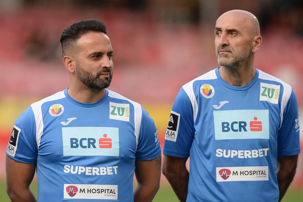 Marian Aliuta (S) si Sebastian Moga (D) in timpul partidei caritabile dintre "Team Belodedici" si "Team Andone", denumita All Star Game, diisputata pe stadionul Dinamo din Bucuresti, luni, 31 mai 2021. EDUARD VINATORU / MEDIAFAX FOTO
