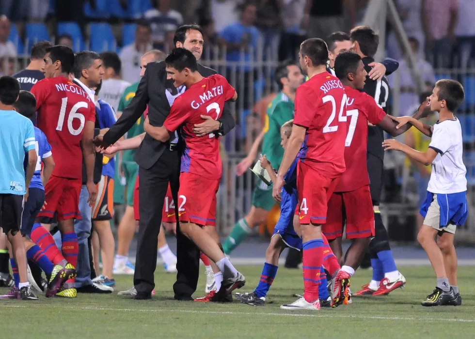 Antrenorul Stelei Ronny Levi il imbratiseaza pe Gabriel Matei.