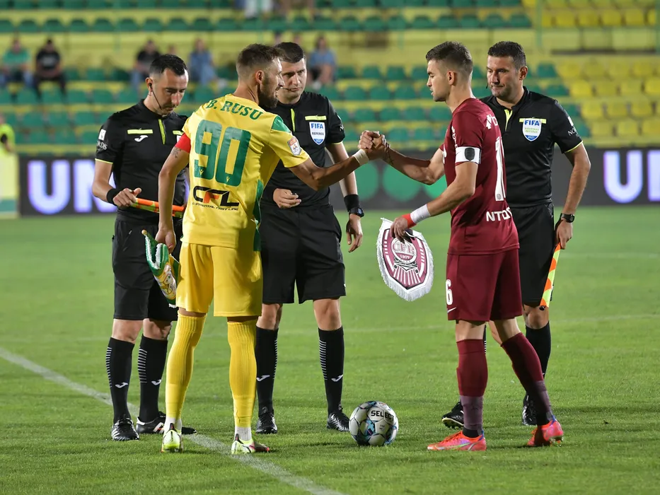 Brigada de arbitrii formata din Vladimir Urzica, Andrei Florin Chivulete si Andrei Constantinescu, alaturi de capitanii Gheorghe Bogdan Rusu si Mateo Susic, prezenta la meciul de fotbal dintre CS Mioveni si CFR Cluj, contand pentru Liga 1 Casa Pariurilor, desfasurat pe Stadionul Orasenesc din Mioveni, sambata 6 august 2021. © FOTO:Razvan Pasarica/SPORT PICTURES