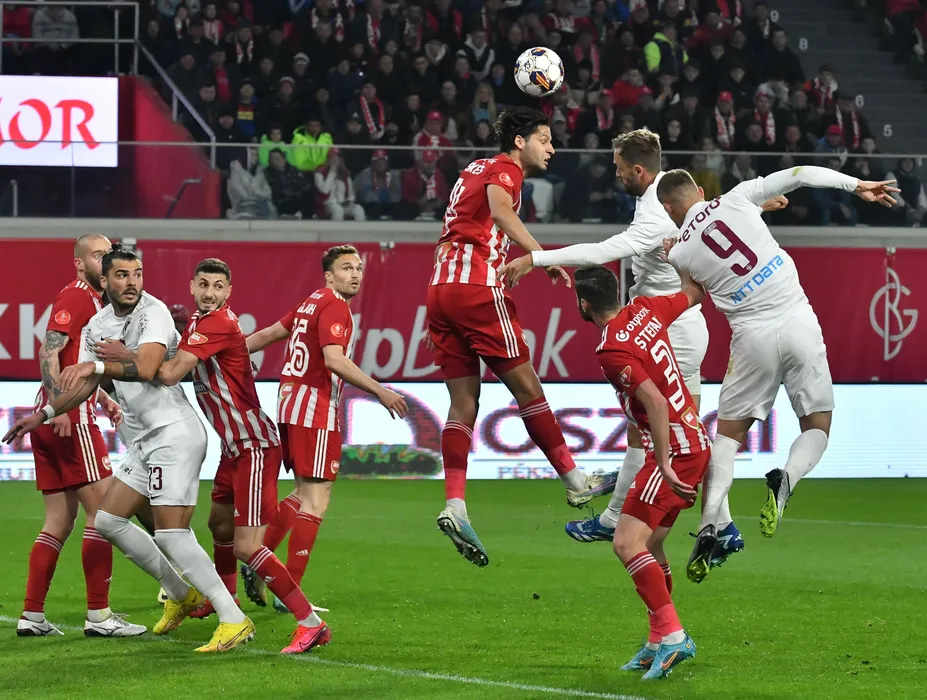 Matija Boben și Akos Kecskes în duel aerian din care rezultă golul egalizator al echipei clujene în meciul de fotbal dintre FC Sepsi OSK Sfantu Gheorghe și FC CFR 1907 Cluj SA, contând pentru SuperLiga Superbet Play-Off, desfășurat pe Stadionul SEPSI Arena OSK din Sfântu Gheorghe, vineri 29 martie 2024. © FOTO: Bogdan BALAS/SPORT PICTURES