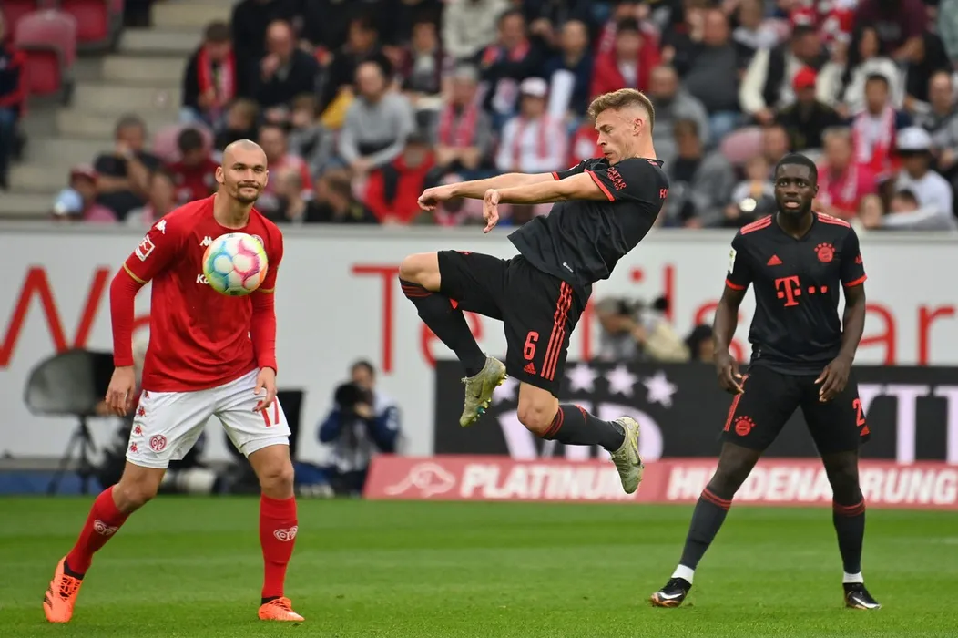 Joshua KIMMICH (FC Bayern Munich), action,duels versus Ludovic AJORQUE (1.FSV FSV FSV Mainz 05). Football 1st Bundesliga season 2022/2023, 29th matchday, matchday29 1.FSV FSV FSV Mainz 05 - FC Bayern Munich 3-1 on April 22nd, 2023, MEWA Arena Mainz. ?,Image: 771183650, License: Rights-managed, Restrictions: 19:11:44, Model Release: no