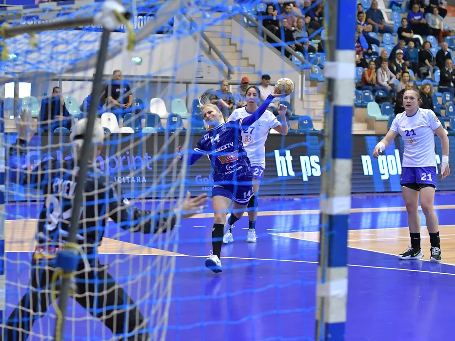 Zeljka Nikolic și Dziyana Ilyina în meciul de handbal feminin dintre SCM Univeristatea Craiova și SCM Gloria Buzău, contând pentru Liga Florilor MOL, desfășurat în Sala Polivalentă din Craiova, sâmbătă 5 octombrie 2024. © FOTO: Remus BADEA/SPORT PICTURES