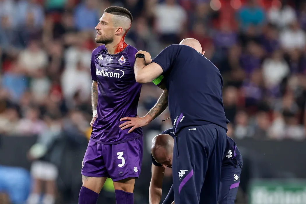 Cristiano Biraghi of ACF Fiorentina, bleeding, is treated after being hit by an object thrown by west ham supporters during the Conference League Final between ACF Fiorentina and West Ham United FC at Eden Arena stadium in Prague (Czech Republic), June 7th, 2023./Sipa USA *** No Sales in Italy ***,Image: 782036287, License: Rights-managed, Restrictions: *** World Rights Except Italy *** ITAOUT, Model Release: no