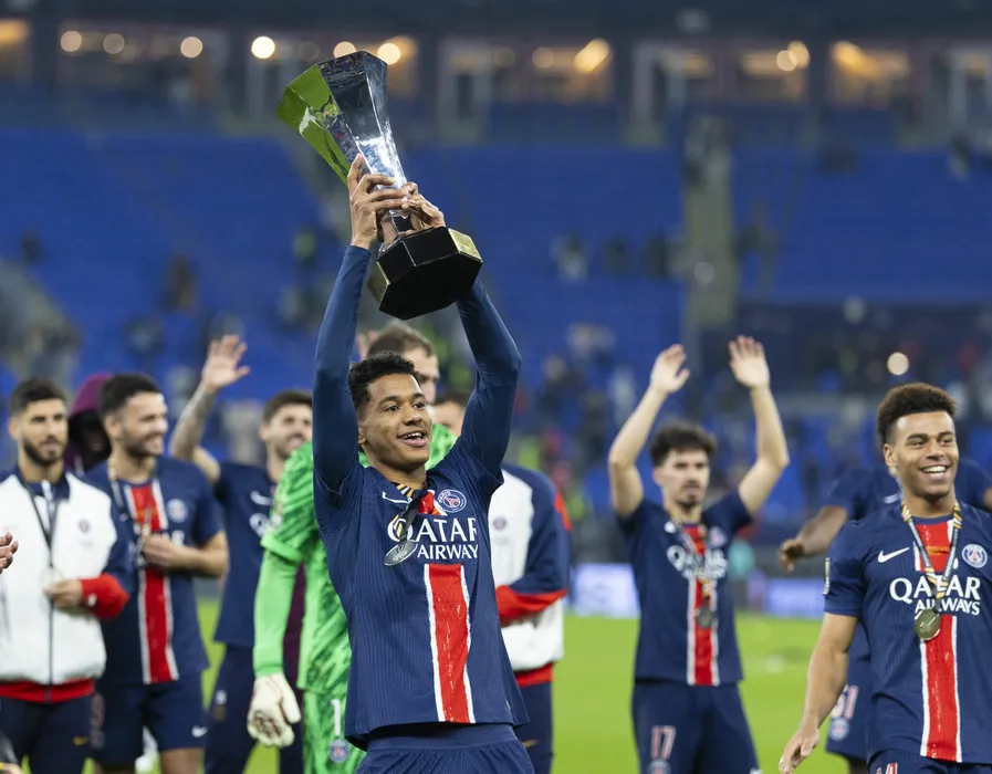 DOHA, QATAR - JANUARY 5: Players of PSG celebrate with championship trophy after the French Champions' Trophy (Trophee des Champions) final football match between Paris Saint-Germain (PSG) and AS Monaco (ASM) at the Stadium 974 in Doha, Qatar on January 5, 2025. Mohammed Saad / Anadolu/ABACAPRESS.COM