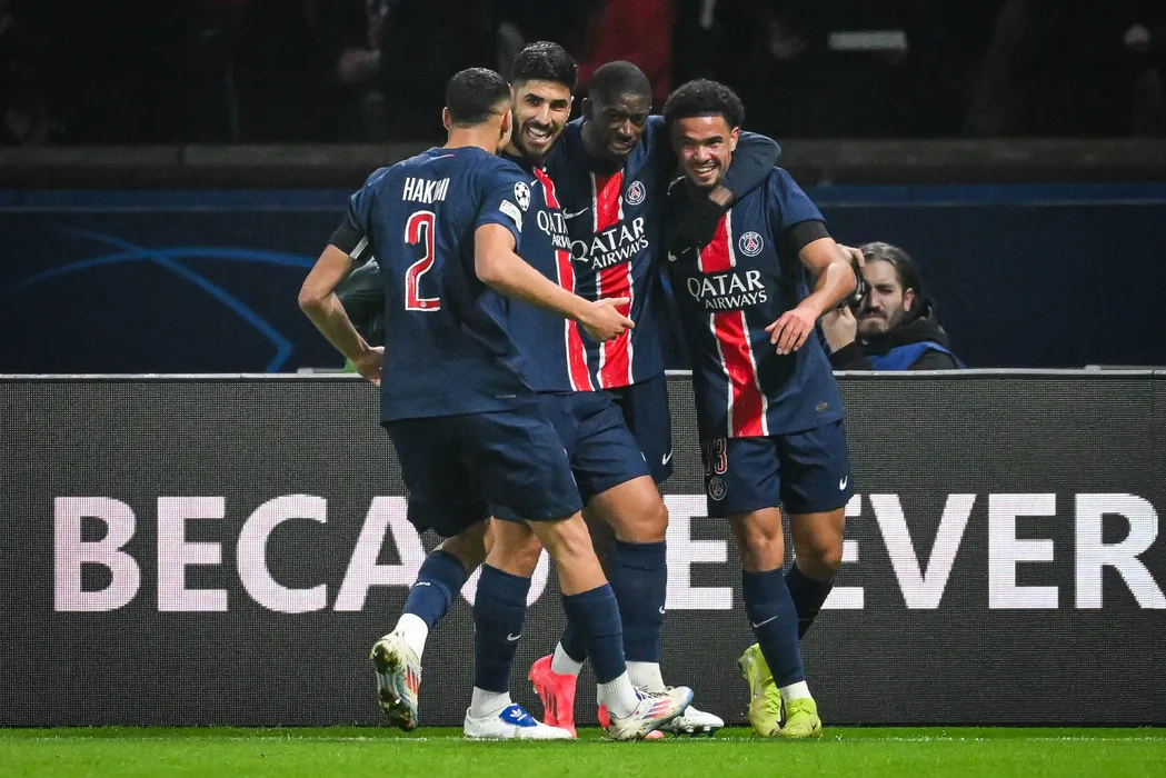06 November 2024, France, Paris: Paris Saint-Germain's Warren Zaire-Emery (R) celebrates scoring his side's first goal with teammates during the UEFA Champions League soccer match between Paris Saint-Germain and Atletico de Madrid at Parc des Princes Stadium. Photo: Matthieu Mirville/ZUMA Press Wire/dpa