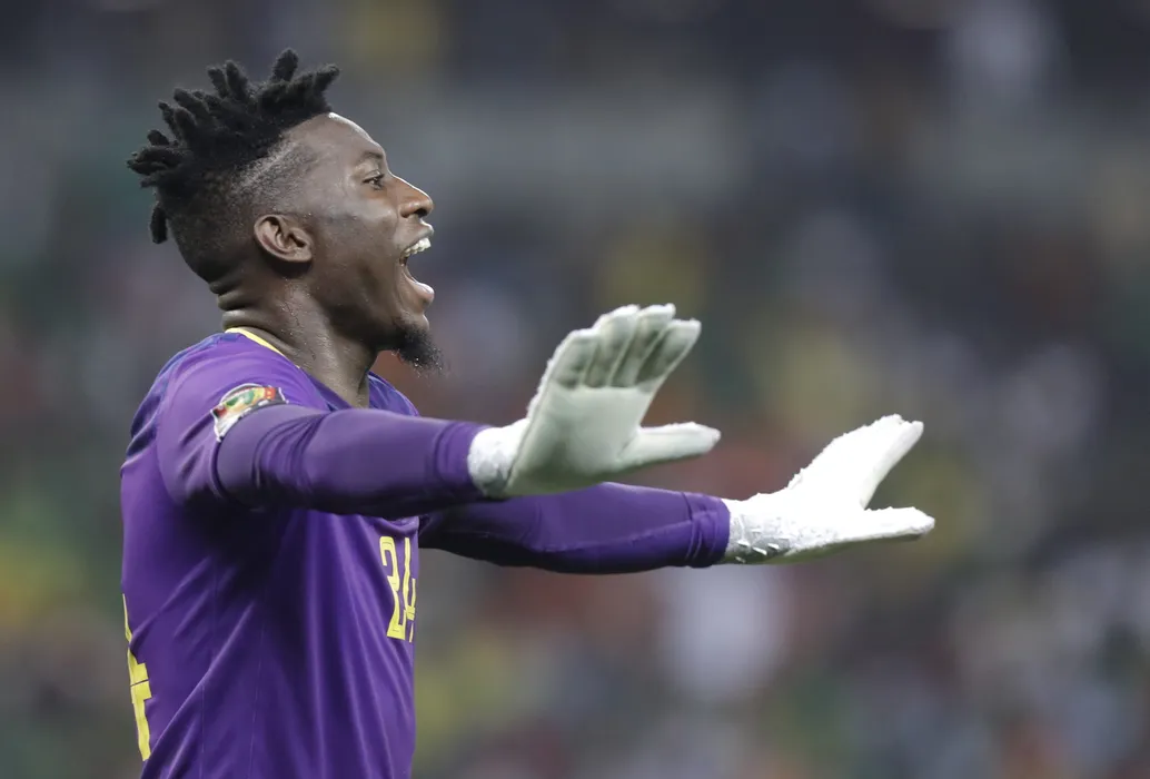 Cameroon's goalkeeper Andre Onana gestures during the African Cup of Nations 2022 quarter-final soccer match between Gambia and Cameroon at the Japoma Stadium in Douala, Cameroon, Saturday, Jan. 29, 2022. (AP Photo/Sunday Alamba)