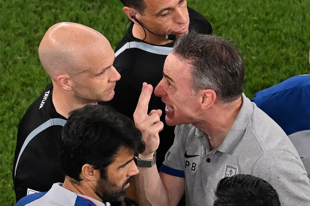 South Korea's Portuguese coach Paulo Bento (R) speaks with English referee Anthony Taylor on the final whistle in the Qatar 2022 World Cup Group H football match between South Korea and Ghana at the Education City Stadium in Al-Rayyan, west of Doha, on November 28, 2022.,Image: 740724629, License: Rights-managed, Restrictions: ALTERNATIVE CROP, Model Release: no