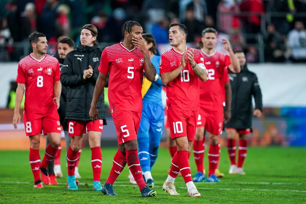 October 15, 2023, St. Gallen, St. Gallen: St. Gallen, Switzerland, October 15th 2023: Manuel Akanji (5 Switzerland) and Granit Xhaka (10 Switzerland) looks dejected and disappointed after their draw result during the UEFA European Qualifiers football match between Switzerland and Belarus at Kybunpark in St. Gallen, Switzerland.,Image: 813944214, License: Rights-managed, Restrictions: * Brazil and Mexico Rights OUT *, Model Release: no