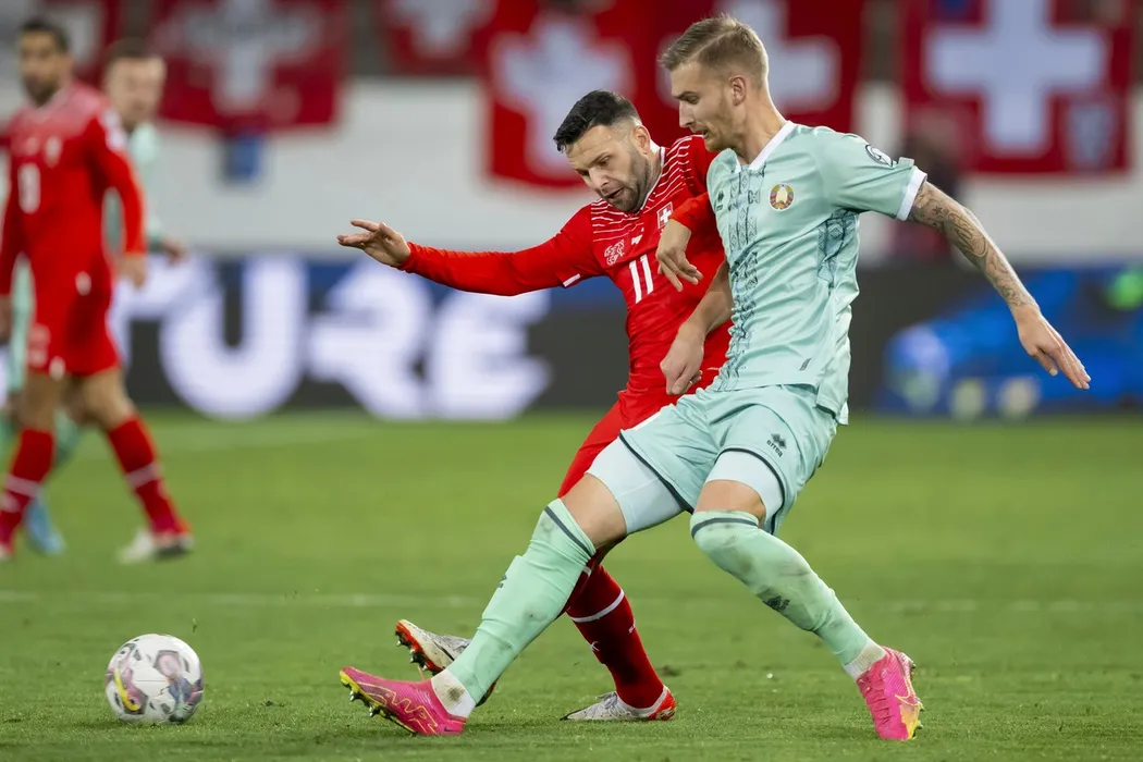 Switzerland's 0Renato Steffen, left, and Belarus' Zakhar Volkov, right, challenge for the ball during the Euro 2024 group I qualifying soccer match between Switzerland and Belarus in St. Gallen, Switzerland, Sunday, Oct. 15, 2023.,Image: 813936924, License: Rights-managed, Restrictions: This content is intended for editorial use only. For other uses, additional clearances may be required., Model Release: no