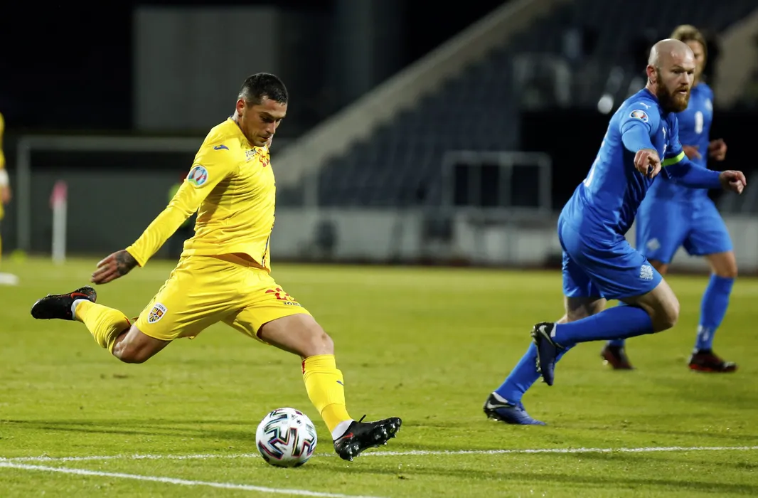 Romania's Nicolae Stanciu, left, crosses during the Euro 2020 playoff semifinal soccer match between Iceland and Romania in Reykjavik, Iceland, Thursday Oct. 8, 2020. (AP Photo/Brynjar Gunnarsson)