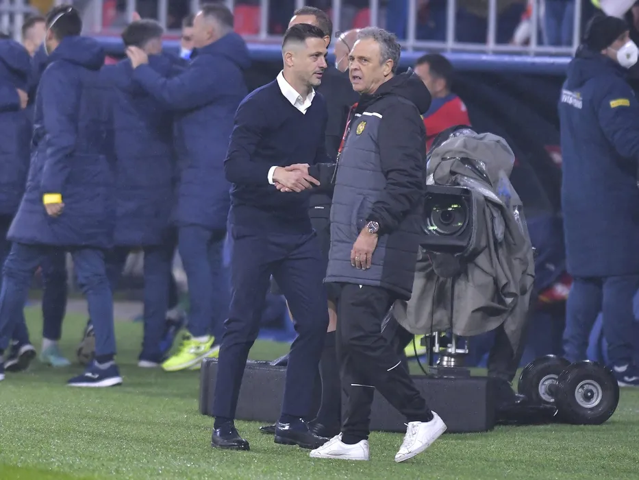 Cei doi antrenori Mirel Radoi si Joaquín Caparrós se saluta dupa meciul de fotbal dintre Romania si Armenia, din cadrul Preliminariilor Campionatului Mondial 2022, desfasurat pe Stadionul Steaua din Bucuresti, luni 11 octombrie 2021. © FOTO:Razvan Pasarica/SPORT PICTURES