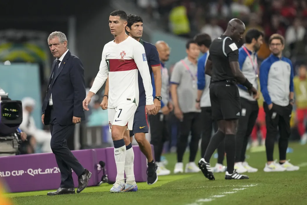 Portugal's Cristiano Ronaldo, center, passes beside his coach Fernando Santos as he leaves the field during the World Cup group H soccer match between South Korea and Portugal, at the Education City Stadium in Al Rayyan , Qatar, Friday, Dec. 2, 2022. (AP Photo/Lee Jin-man)