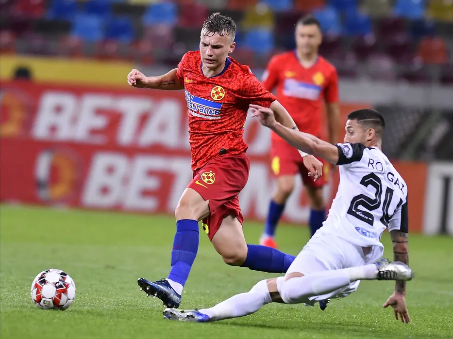 Roberto Romeo si Grigoras Alexandru Pantea in meciul de fotbal dintre FCSB si Gaz Metan Medias, contand pentru play-off-ul Ligii 1 Casa Pariurilor, disputat fara spectatori pe Arena Nationala din Bucuresti, duminica 21 iunie 2020. © FOTO:Razvan Pasarica/SPORT PICTURES