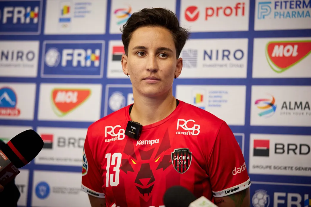 Cristina Laslo la interviu dupa meciul de handbal feminin dintre CSM Bucuresti si CS Gloria 2018 Bistrita-Nasaud, contand pentru Finala Cupei Romaniei Feminin 24-25, desfasurat in Sala Rapid din Bucuresti, duminca 11 mai 2025. © FOTO: Sabin Malisevschi/Sport Pictures