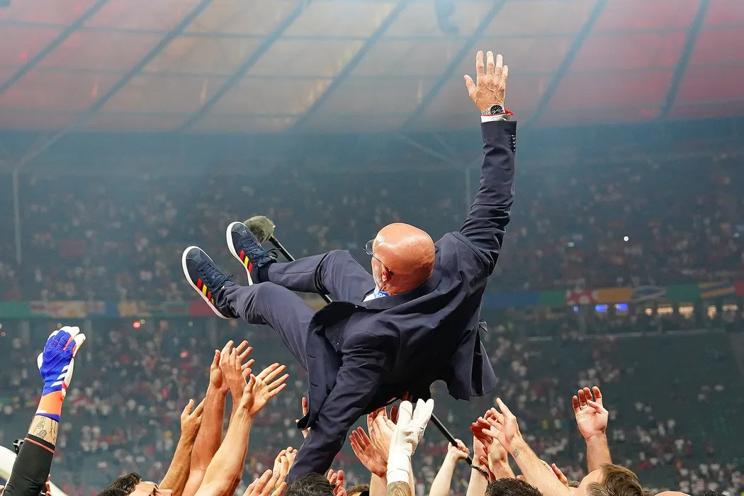 Spain's head coach Luis de la Fuente during the Euro 2024 soccer match between Spain and England at the Olympiastadion, Berlin , Germany - Sunday , July 14 , 2024. Sport - Soccer .,Image: 889727403, License: Rights-managed, Restrictions: *** World Rights Except China, France, and Italy *** CHNOUT FRAOUT ITAOUT, Model Release: no