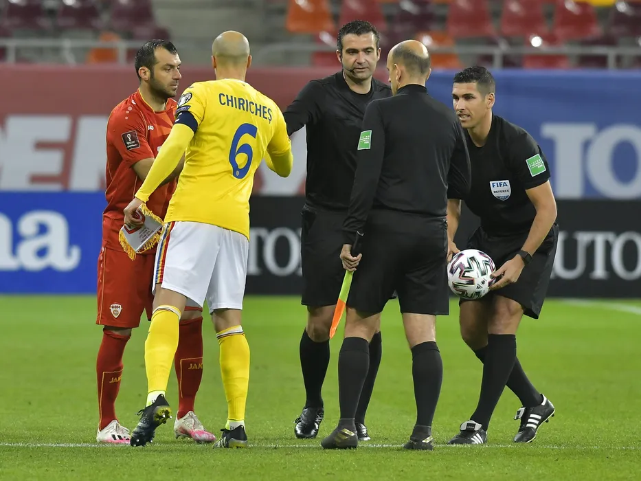 Brigada de arbitrii formata din Luis Campos, Fabio Verissimo si Bruno Rodrigues alaturi de capitanii Goran Pandev si Vlad Chiriches in meciul de fotbal dintre Romania si Macedonia de Nord, din cadrul Preliminariilor Campionatului Mondial 2022, desfasurat fara spectatori pe Arena Nationala din Bucuresti, joi 25 martie 2021. © FOTO:Razvan Pasarica/SPORT PICTURES