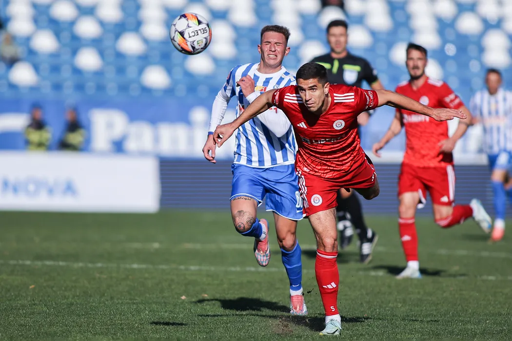 Yves Angha Martin și Andrei Cosmin Gheorghiță în meciul de fotbal dintre Poli Iași si SC Oțelul Galați, contând pentru SuperLiga Superbet, desfășurat pe Stadionul Emil Alexandrescu din Iași, duminică 3 noiembrie 2024. © FOTO: Sorin PANĂ/SPORT PICTURES