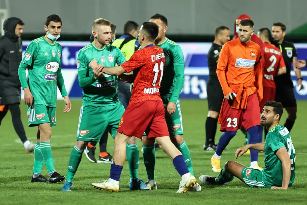 Altercatie intre Olimpiu Morutan(C), de la FCSB, si jucatorii Sepsi OSK in timpul meciului de fotbal din etapa 3 a play-off-ului Ligii 1, disputat pe stadionul Marin Anastasovici din Giurgiu, duminica, 25 aprilie 2021. GEORGE FILIP / MEDIAFAX FOTO