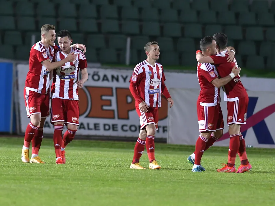 Bucurie a fotbalistilor de la Sepsi dupa un gol marcat cu Bogdan Alexandru Mitrea, Florin Flavius Purece si Marius Stefanescu in meciul de fotbal dintre Sepsi OSK Sfantu Gheorghe si FCSB, contand pentru Play-off-ul Ligii 1 Casa Pariurilor, desfasurat fara spectatori pe Stadionul Municipal din Sfantu Gheorghe, duminica 16 mai 2021. © FOTO:Razvan Pasarica/SPORT PICTURES