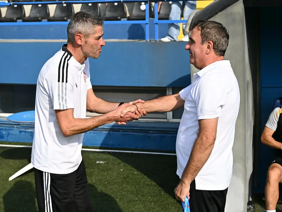 Antrenorii celor doua echipe Dumitru Valentin Suciu si Gheorghe Hagi se saluta inaintea meciului meciul de fotbal dintre Farul Constanta si Sepsi OSK Sfantu Gheorghe, contand pentru Superliga Superbet, desfasurat pe Stadionul central al Academiei Gheorghe Hagi din Ovidiu, duminica 22 septembrie 2024. © FOTO:Razvan Pasarica/SPORT PICTURES