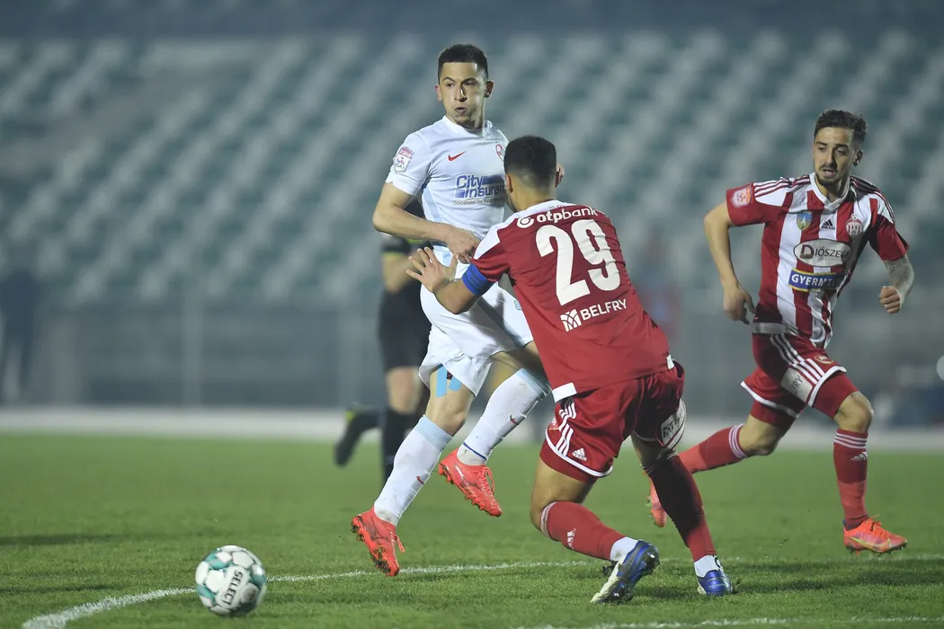 Olimpiu Morutan (S), de la FCSB, suteaza in timpul meciului de fotbal contra echipei Sepsi OSK din etapa 30 a Ligii 1, disputat pe stadionul Municipal din Sfantu Gheorghe, sambata,10 aprilie 2021. ALEX NICODIM / MEDIAFAX FOTO