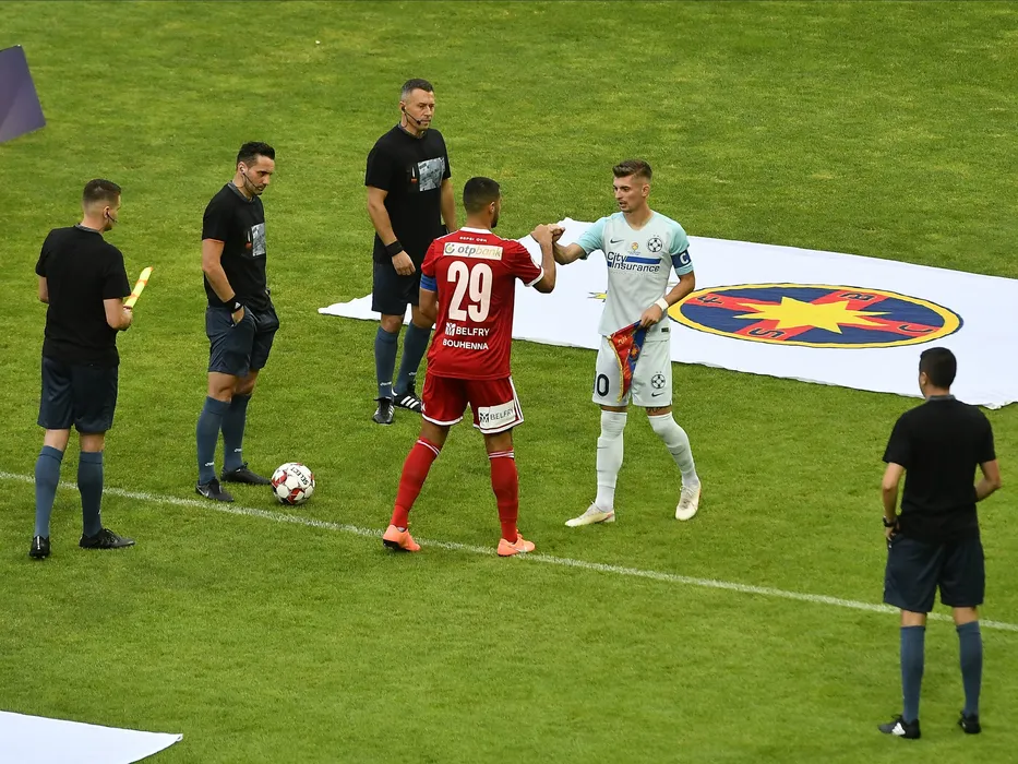 Capitanii Rachid Ahmed Bouhenna si Florin Tanase se saluta alaturi de brigada de arbitrii cu Sebastian Coltescu si Ovidiu Artene in meciul de fotbal dintre FCSB si Sepsi OSK Sfantu Gheorghe, finala Cupei Romaniei, disputat fara spectatori pe Stadionul Ilie Oana din Ploiesti, miercuri 22 iulie 2020. © FOTO:Razvan Pasarica/SPORT PICTURES