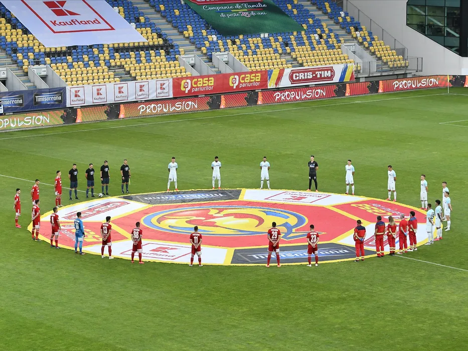 Cele doua echipe tin un minut de reculegere inaintea meciului de fotbal dintre FCSB si Sepsi OSK Sfantu Gheorghe, finala Cupei Romaniei, disputat fara spectatori pe Stadionul Ilie Oana din Ploiesti, miercuri 22 iulie 2020. © FOTO:Razvan Pasarica/SPORT PICTURES