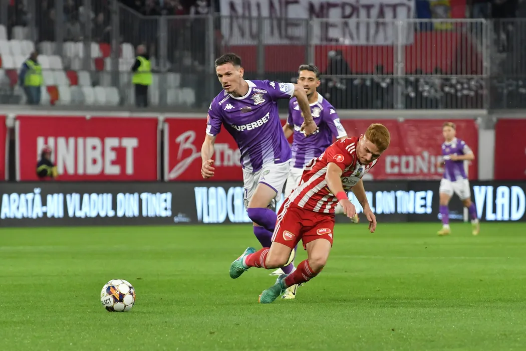 Ermal Krasniqi și Andre Mihai Dumitrescu în meciul de fotbal dintre Sepsi OSK Sfantu Gheorghe și FC Rapid 1923 București, contând pentru SuperLiga Superbet Play-Off, desfășurat pe Stadionul SEPSI Arena OSK din Sfântu Gheorghe, vineri 10 mai 2024. © FOTO: Bogdan BALAS/SPORT PICTURES