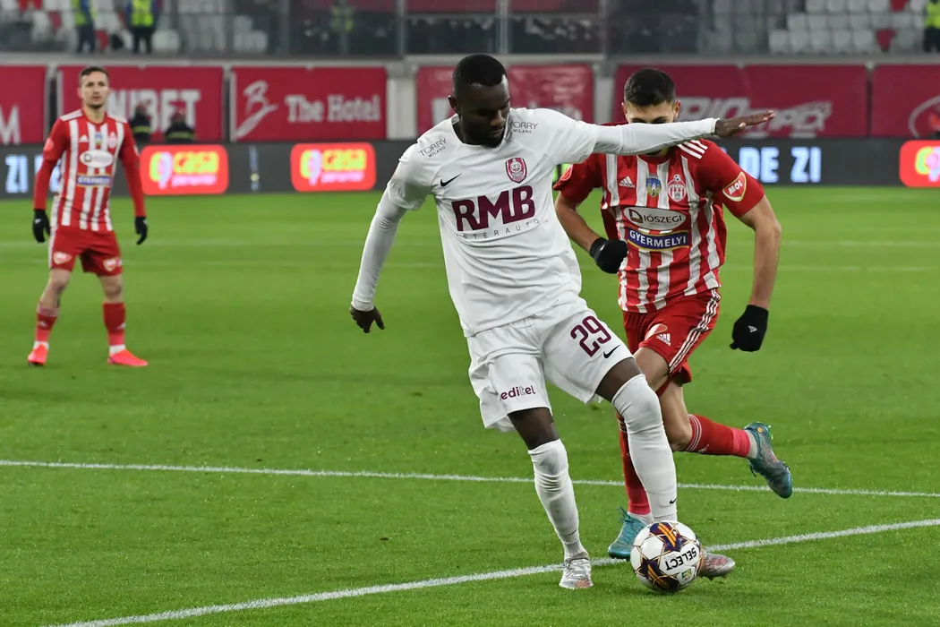 Durel Bel Daniel Avounou în meciul de fotbal dintre FC Sepsi OSK Sfantu Gheorghe și FC CFR 1907 Cluj SA, contând pentru SuperLiga Superbet, desfășurat pe Stadionul SEPSI Arena OSK din Sfântu Gheorghe, duminică 17 decembrie 2023. © FOTO: Bogdan BALAS/SPORT PICTURES