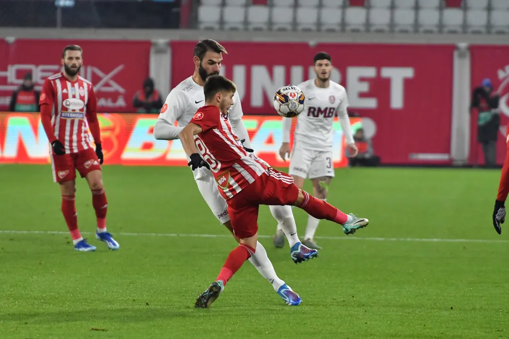 Panagiotis Tachtsidis și Ion Gheorghe în meciul de fotbal dintre FC Sepsi OSK Sfantu Gheorghe și FC CFR 1907 Cluj SA, contând pentru SuperLiga Superbet, desfășurat pe Stadionul SEPSI Arena OSK din Sfântu Gheorghe, duminică 17 decembrie 2023. © FOTO: Bogdan BALAS/SPORT PICTURES