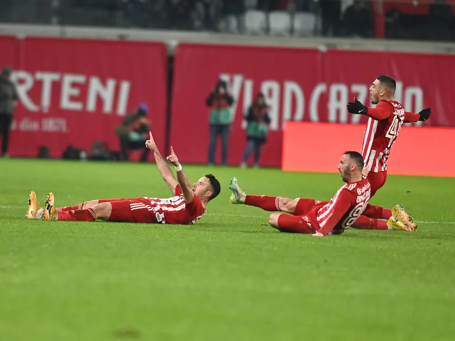 Adnan Aganovic se bucura dupa un gol marcat alaturi de Radoslav Dimitrov si Denis Ciobotariu in meciul de fotbal dintre Sepsi OSK Sfantu Gheorghe si FC U Craiova, contand pentru Superliga Superbet, desfasurat pe Sepsi Arena din Sfantu Gheorghe, vineri 16 martie 2023. © FOTO:Razvan Pasarica/SPORT PICTURES