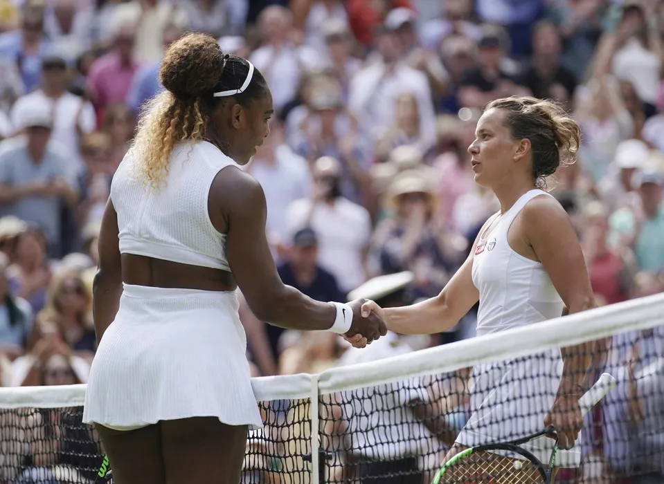 Serena Williams of U.S.A. (L) shakes hands with Barbora Strycova of Czech Republic after winning the ladies' singles semi-final of the Championships, Wimbledon at the All England Lawn Tennis and Croquet Club in London, United Kingdom on July 11, 2019. Serena Williams won the match to advance final.,Image: 688302433, License: Rights-managed, Restrictions: This content is intended for editorial use only. For other uses, additional clearances may be required.
