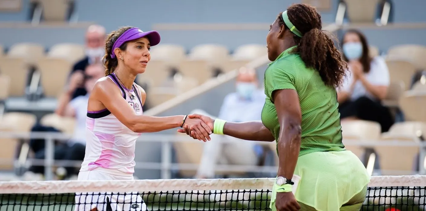 Mihaela Buzarnescu of Romania & Serena Williams of the United States after their second-round match at the 2021 Roland Garros Grand Slam Tournament