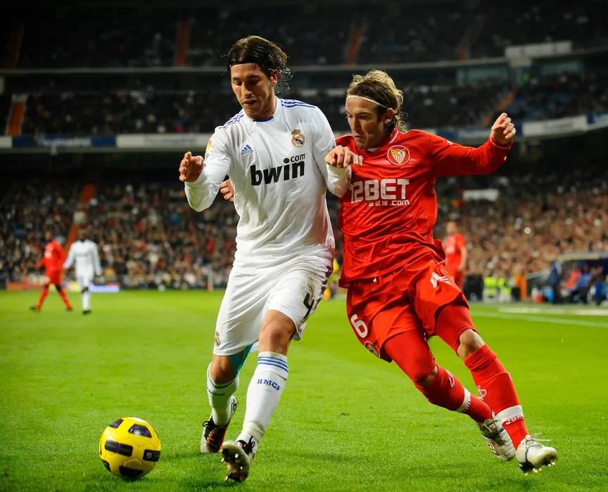 Real Madrid's defender Sergio Ramos (L) vies with Sevilla's midfielder Diego Capel during the Spanish league football match Real Madrid CF vs Sevilla FC on December 19, 2010 at the Santiago Bernabeu stadium in Madrid.,Image: 88683533, License: Rights-managed, Restrictions: , Model Release: no