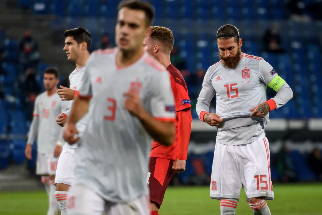 Spain's defender Sergio Ramos reacts after missing his second penalty kick during the UEFA Nations League football match between Switzerland and Spain at St. Jakob-Park stadium in Basel, on November 14, 2020.,Image: 569012758, License: Rights-managed, Restrictions: , Model Release: no