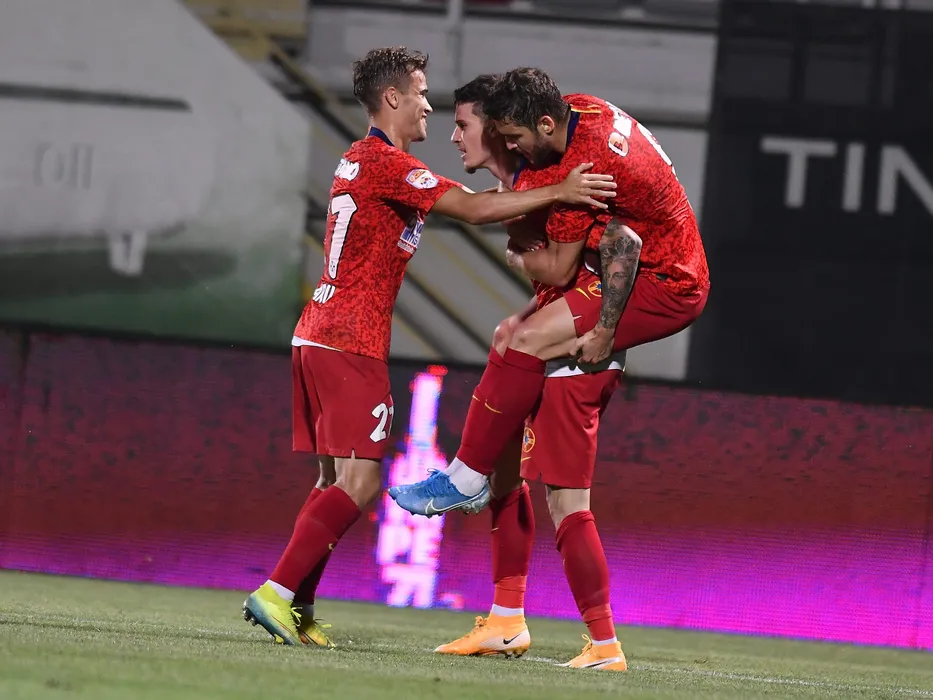 Dennis Man se bucura dupa un gol marcat alaturi de Darius Dumitru Olaru si Sergiu Florin Bus in meciul de fotbal dintre Astra Giurgiu si FCSB, contand pentru Liga 1 Casa Pariurilor, desfasurat pe Stadionul Marin Anastasovici din Giurgiu, sambata 22 august 2020. © FOTO:Razvan Pasarica/SPORT PICTURES