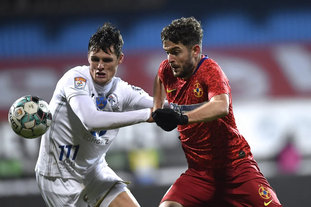 Sergiu Bus (D), de la FCSB, lupta pentru balon cu Ondrej Baco (S), de la Gaz Metan, in timpul meciului de fotbal din etapa a XI-a a Ligii 1, disputat pe stadionul Gaz Metan din Medias, luni, 23 noiembrie 2020. ALEX NICODIM / MEDIAFAX FOTO