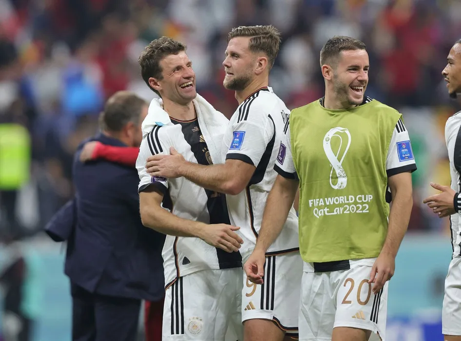 firo : 11/27/2022, Football, Soccer, FIFA WORLD CUP 2022 QATAR, World Cup 2022 Qatar, World Cup 2022 Qatar, Group stage, Group E, Match Spain . ESP - Germany 1:1 Thomas Muller , with , and , Niclas Fullkrug , half figure , final jubilation,Image: 740559190, License: Rights-managed, Restrictions: GERMANY OUT, Model Release: no