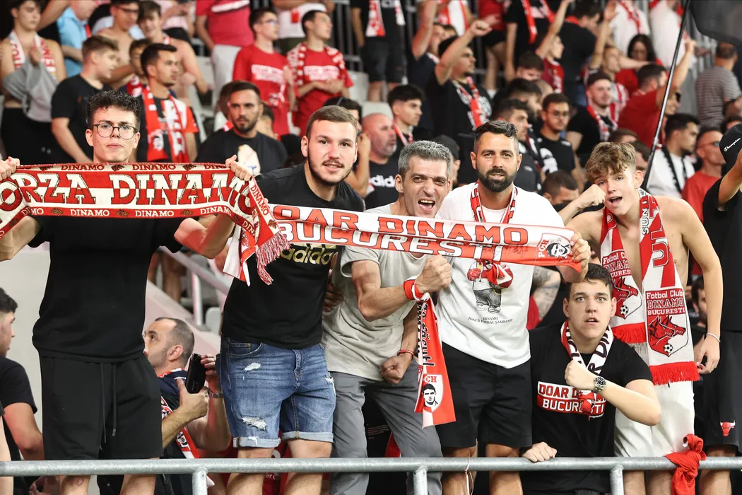 Suporterii dinamovisti isi incurajeaza favoritii la meciul de fotbal dintre Dinamo Bucuresti si FC Botosani, din cadrul Superligii Superbet, desfasurat pe Stadionul National Arcul de Triumf din Bucuresti, luni 14 august 2023. © FOTO:Gheorghe Fluster/SPORT PICTURES