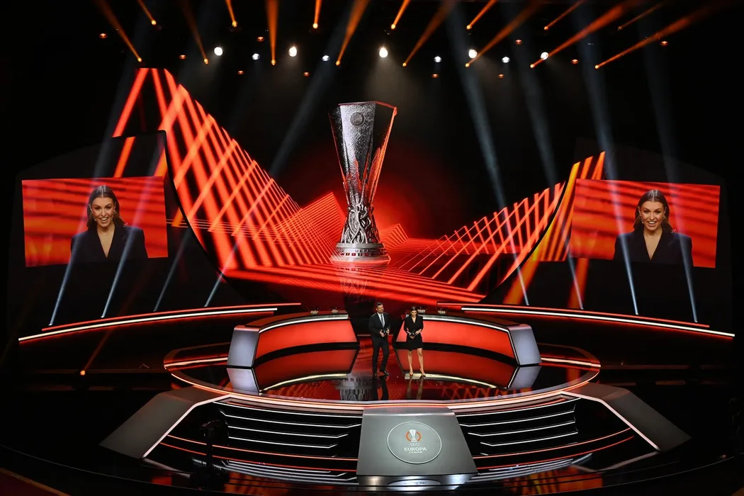 This picture shows the stage as TV host Pedro Pinto arrives to the ceremony prior to the draw for the UEFA Europa League football tournament in Istanbul on August 27, 2021.,Image: 629010708, License: Rights-managed, Restrictions: , Model Release: no, Credit line: Profimedia