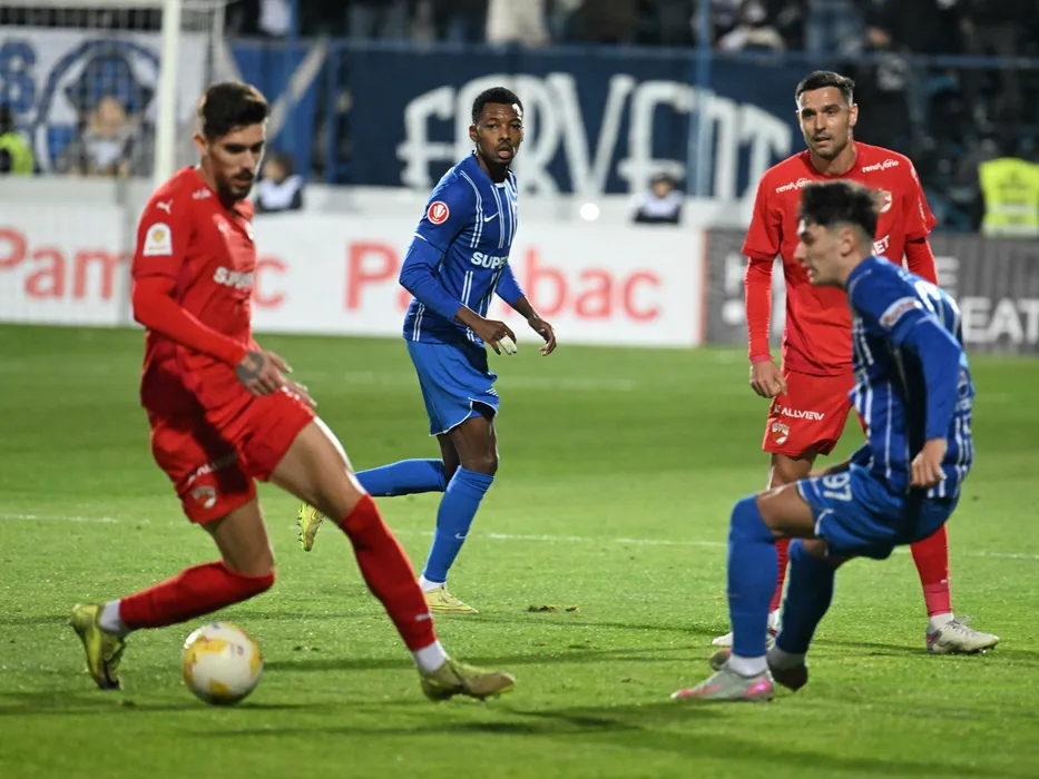 Pereira Steve Jose Furtado si Georgi Ventsislavov Milanov in meciul de fotbal dintre Farul Constanta si Dinamo Bucuresti, contand pentru Cupa Romaniei Betano, desfasurat pe Stadionul central al Academiei Gheorghe Hagi din Ovidiu, miercuri 3 decembrie 2025. © FOTO:Razvan Pasarica/SPORT PICTURES