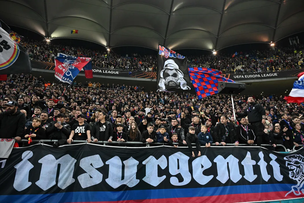 Galeria ros albastra isi aplauda favoritii dupa meciul de fotbal dintre FCSB si Olympique Lyon, din cadrul UEFA Europa League, desfasurat pe Arena Nationala din Bucuresti, joi 6 martie 2025. © FOTO:Razvan Pasarica/SPORT PICTURES